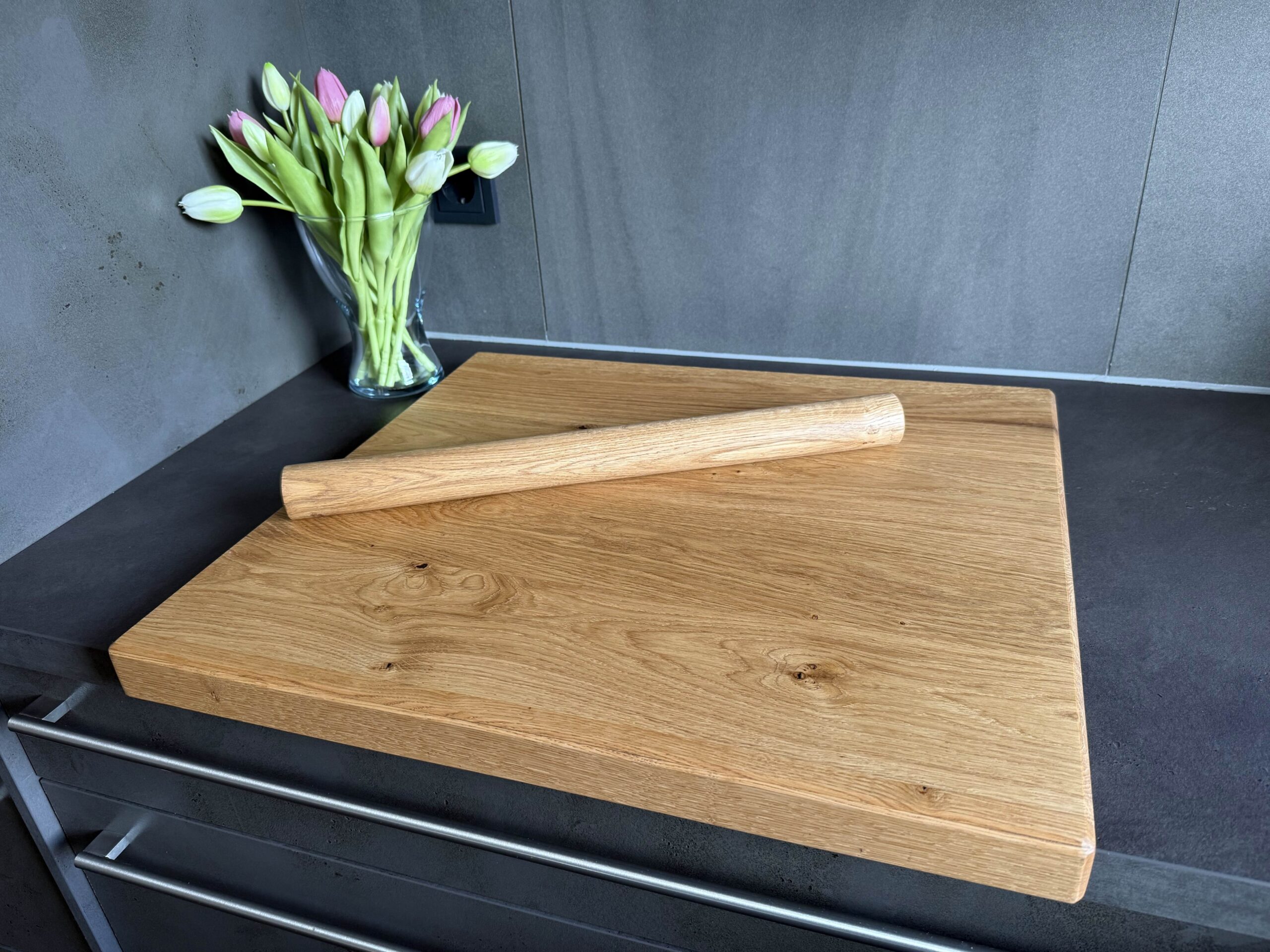 Die Anschlagkante sorgt dafür, dass das Brett sicher an der Küchenarbeitsplatte oder am Tisch anliegt – für entspanntes Arbeiten ohne Verrutschen. Ob Brotteig, Pizza oder Plätzchen: Dieses Backbrett ist ein verlässlicher Begleiter für den Alltag und besondere Momente in der Küche.